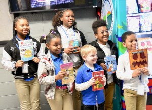 Carver Elementary School students hold up books selected from the school’s new Book Nook book vending machine. The students were the first to try out the new machine provided by First Mississippi Federal Credit Union. Photo by Thomas Howard